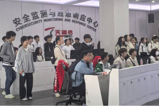 随后,在行业专家的引导下,同学们首先参观了公司的网络安全科技展厅和安全监测与应急响应中心。展厅内从早期的防火墙设备到最新的态势感知平台、威胁情报系统、云安全解决方案,一幅中国网络安全技术发展的生动画卷徐徐展开。专家详细讲解了天融信在边界安全、数据安全、工业互联网安全、物联网安全等关键领域的技术成果与应用案例,令同学们对网络安全技术的实际应用场景和重要性有了更为直观和深刻的认识。