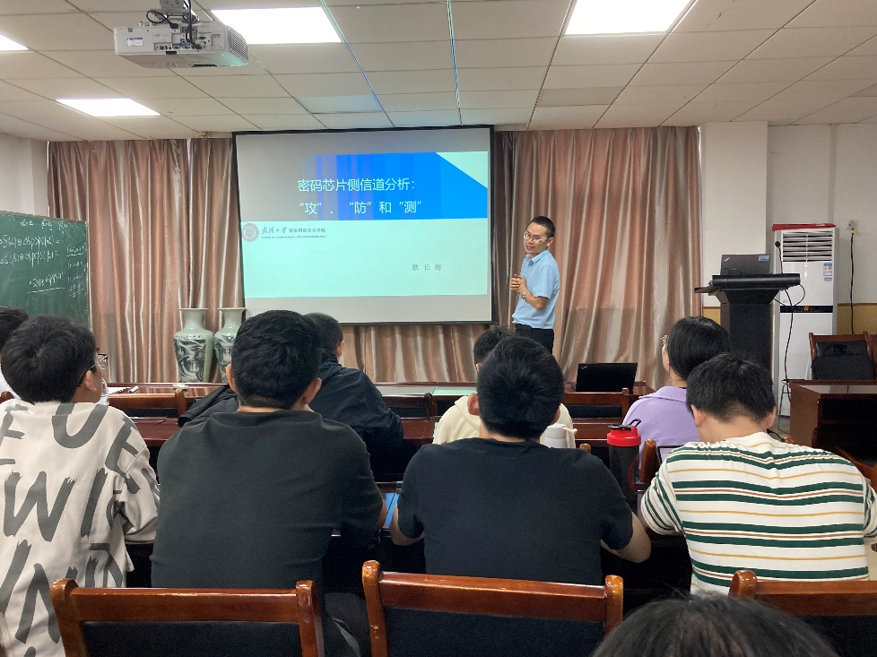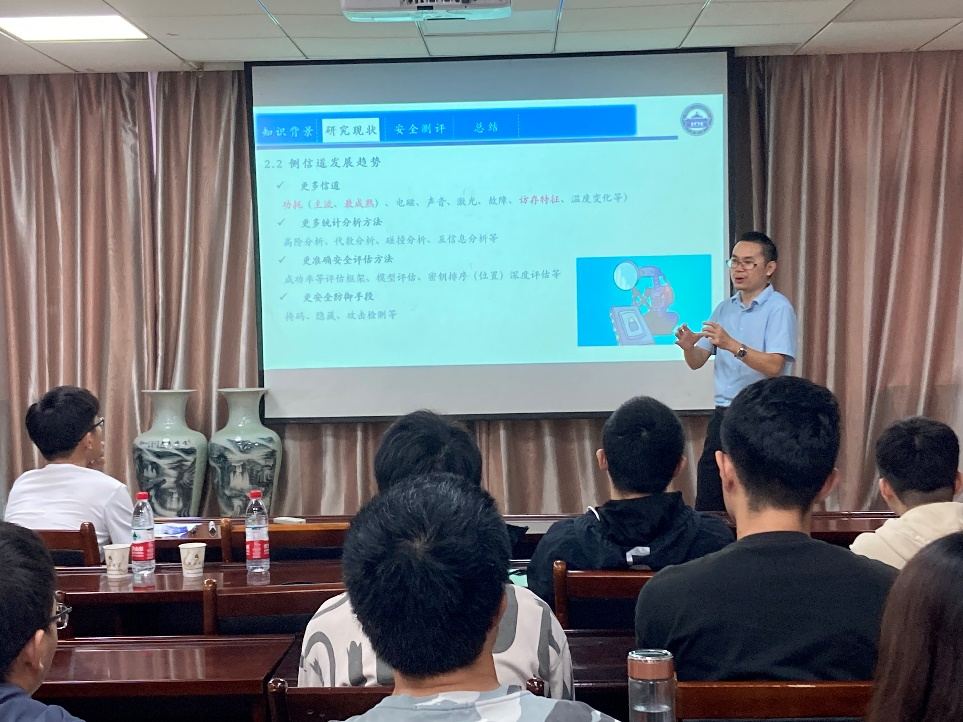 报告中,欧长海教授从“攻”、“防”与“测”三个方面,向在场师生介绍了侧信道分析的背景知识和研究现状,探讨了密码侧信道泄露的机制,揭示了加密信息传输过程中可能发生的信息泄露。欧长海教授指出,这种泄露在通过侧信道攻击手段进行采集分析后,会对设备的安全性造成威胁。随后,欧长海教授介绍了侧信道分析的前沿技术和挑战,以及在密码侧信道分析中的主流技术、测评和防护方法。此外,报告还特别介绍了欧长海教授团队近年来在IEEE TIFS、TCAD、TC等期刊和会议上的相关工作。