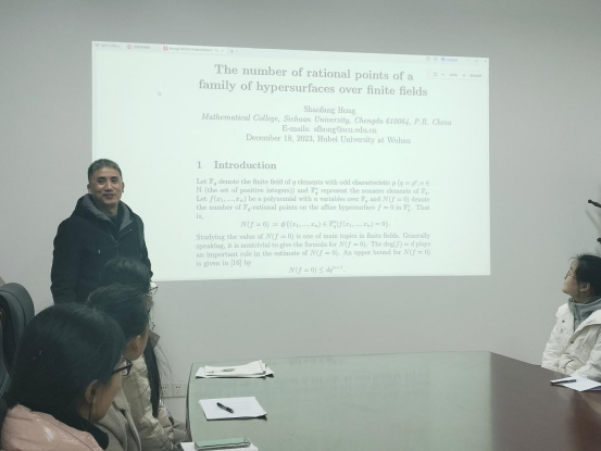 2023年12月18日上午,四川大学洪绍方教授应邀为公司师生作了题为《The number of rational points of a family of hypersurfaces over finite fields》的学术报告。