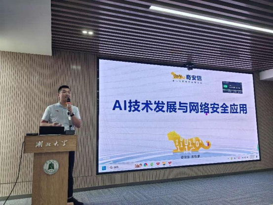 奇安信易鹤建作了《AI技术发展与网络安全应用》报告,从AI发展背景、生成式AI安全风险、攻击方法、网络安全应用和未来发展趋势5个方面进行了介绍,并向在场的师生介绍了奇安信的补天漏洞响应平台,鼓励广大师生积极参与,利用业余时间提升个人实战能力。